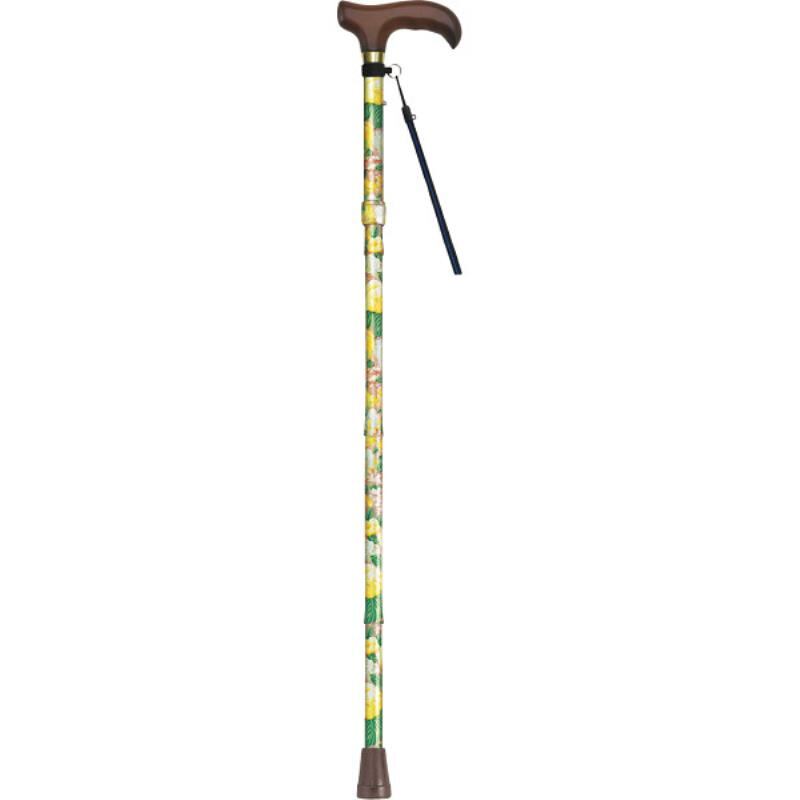 華やかな花柄の折りたたみステッキ。持ち運びに便利な携帯袋付き。長さの調節も簡単にできます。折りたたみ時27cmとコンパクト。安心のSGマーク付き。