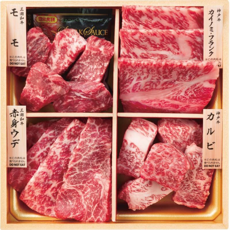 商品内容:●<一の重>兵庫県産神戸牛カルビ(バラ)サイコロステーキ64g、兵庫県産神戸牛バラ(カイノミ・フランク)焼肉用64g、兵庫県産三田和牛赤身カタ(ウデ)焼肉用66g、兵庫県産三田和牛モモサイコロステーキ66g<二の重>兵庫県産神戸牛赤身肩肉すき焼き用90g、兵庫県産三田和牛肩ロースすき焼き用90g【別添】ステーキソース20g