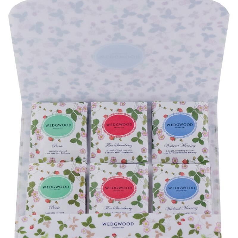 ウェッジウッドを代表する人気柄「ワイルド ストロベリー」をウォレットタイプのパッケージに入れた3種類の紅茶が楽しめるティーバッグのアソートです。ちょっとしたお返しやプチギフトにぴったりな商品です。