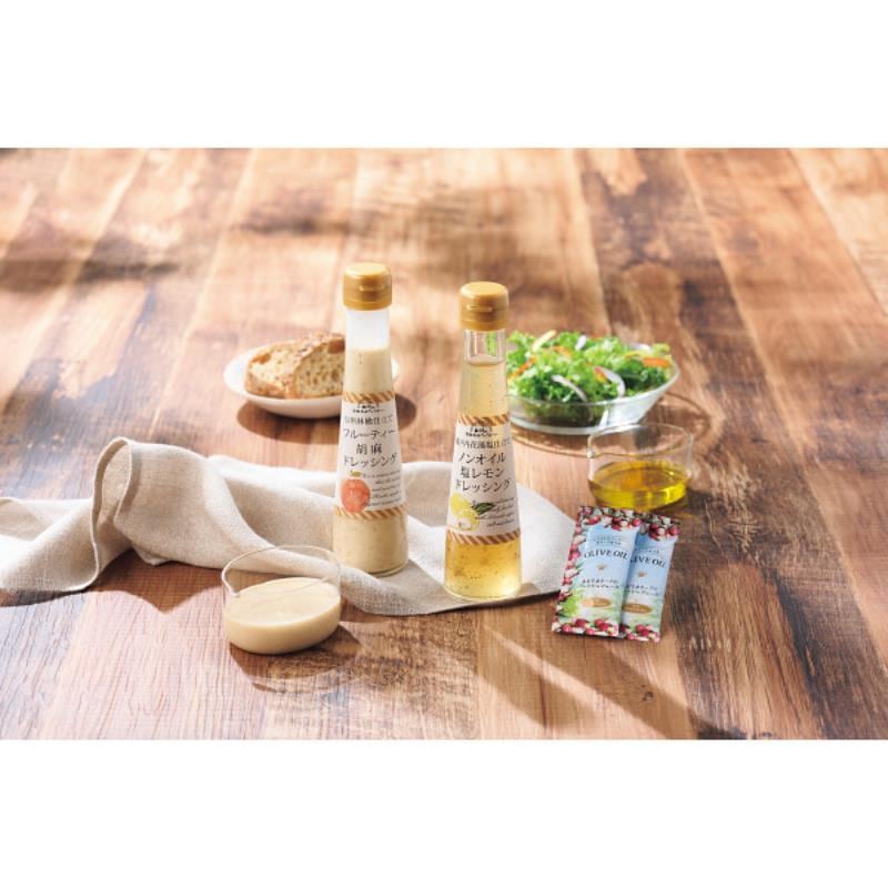 商品内容:●ドレッシング(信州林檎仕立てフルーティー胡麻)120ml×1、ドレッシングタイプ調味料(瀬戸内花藻塩仕立てノンオイル塩レモン)120ml×1、エクストラバージンオリーブオイル8g×5