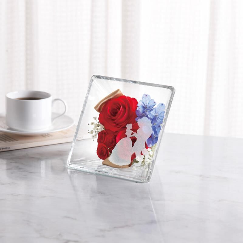 独自の乾燥方法で生花を美しくドライ加工。着色は一切していない、特殊加工のフレッシュドライフラワー。フレッシュさと鮮やかな色が残るドライフラワーは、生花に近い質感で長期間きれいなままでお楽しみいただけます。ガラス面にキャラクターのシルエットをガラスカッティングで表現しています。美しい『美女と野獣』の世界観ををお楽しみください。