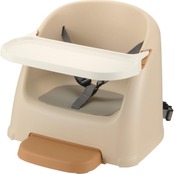 背もたれ、ステップ、座面シートで姿勢をサポートするブースターチェアです。ステップは、足がブラつかず両足がきちんとつくので、落ちついて食事に集中できます。ステップが不要になったら本体下に収納できます。座面シートでズリ落ちを防止し、安定して座ることができます。フラット座面・ポリエステル製の股ベルトなので、足まわりも窮屈感なく座れます。テーブルはロックレバーを押すだけで、簡単に取り外せます。