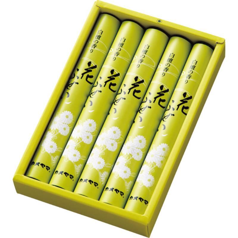 白檀の香りの束線香5束入です。鮮やかな黄色が目をひくカメヤマの定番お線香です。