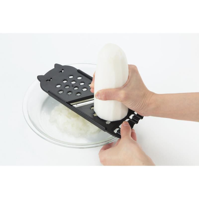 押しても引いても切れる両刃スライサーとおろし器、飾り切りもできる調理器です。耳や目のついた本体と、おろし部分はネコの顔型になっています。さらに飾り切り部分も猫型です。野菜、ハム、チーズなど、何でもネコ型に!