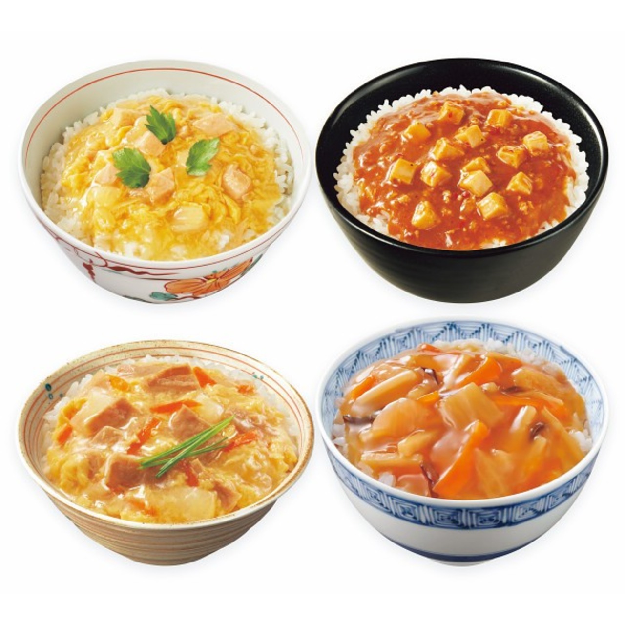 商品内容:●中華丼140g×5・豚たま丼140g×5・親子丼140g×5・四川風麻婆丼140g×5(計20個)