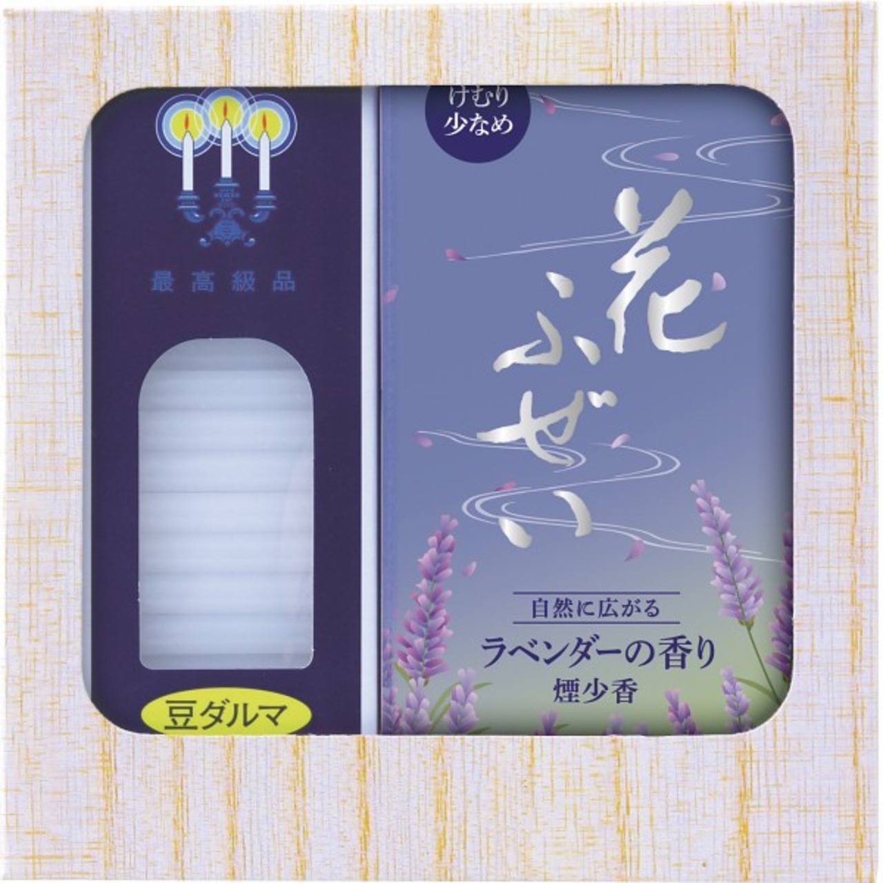 商品内容:●花ふぜいラベンダー煙少香線香(約100g)×1箱、カメヤマローソク豆ダルマ(90g)×1箱