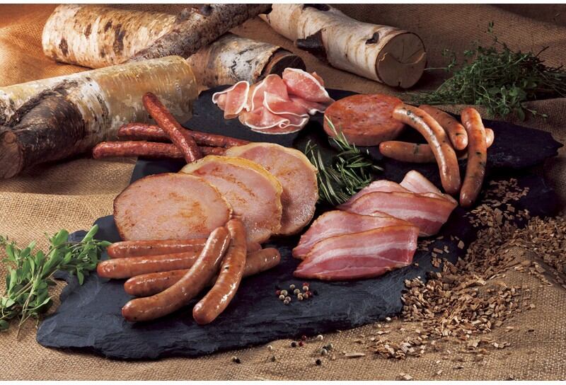 商品内容:炭火焼ベーコン(約80g)・荒挽ウインナー(約100g)・生ハムロース(約40g)・荒挽ソーセージ(約70g)・スティッククラコウ(約80g)・燻しロースハム(約60g)・ピルカウインナー(約120g)×各1