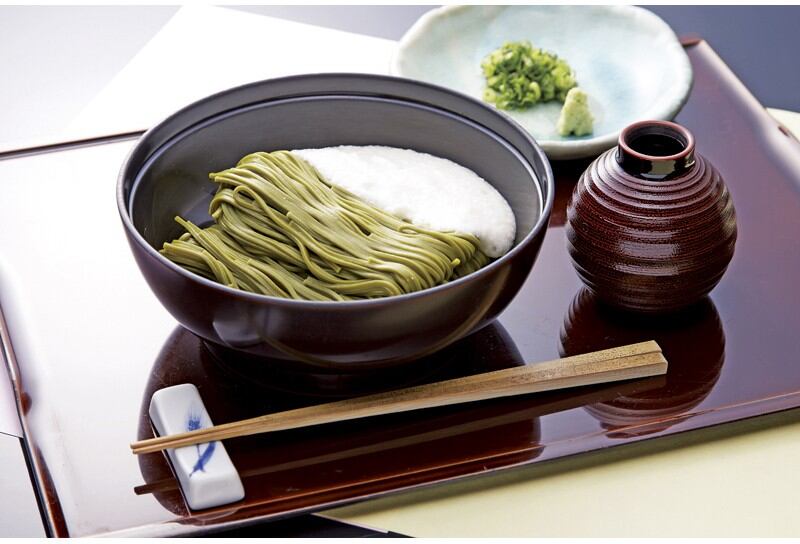 静岡県産抹茶とやまいもを入れじっくり乾燥させた「茶そば」とからみやすいよう大和芋と長芋を混ぜ合わせた専用の「とろろ」のセットにしました。