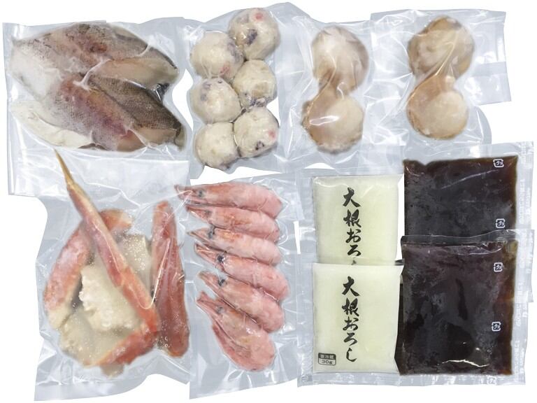 商品内容:ゆでずわいがにカット(約100g)×1、ボイル帆立(約20g)×4、ボイル海老(約6g)・たこ入つみれ(約15g)×各6、助宗鱈切身(約40g)・大根おろし(約30g)・たれ(濃縮醤油仕立て)(約50ml)×各2