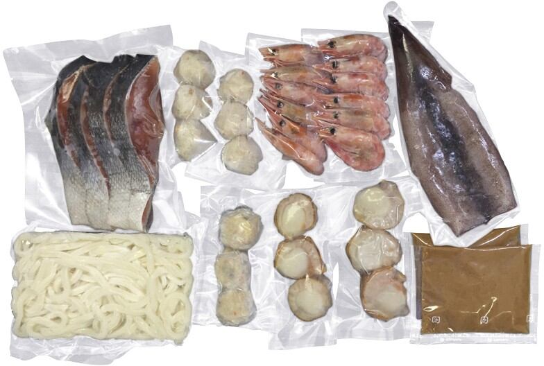 商品内容:秋鮭切身(約40g)×4、ボイル海老(約6g)×12、ボイル帆立(約20g)×6、かに入つみれ(約20g)・えび入つみれ(約20g)・とりごぼうつみれ(約20g)×各3、ツボ抜きいか(約100g)・冷凍うどん(約250g)×各1、たれ(濃縮:味噌仕立て)(約50g)×2