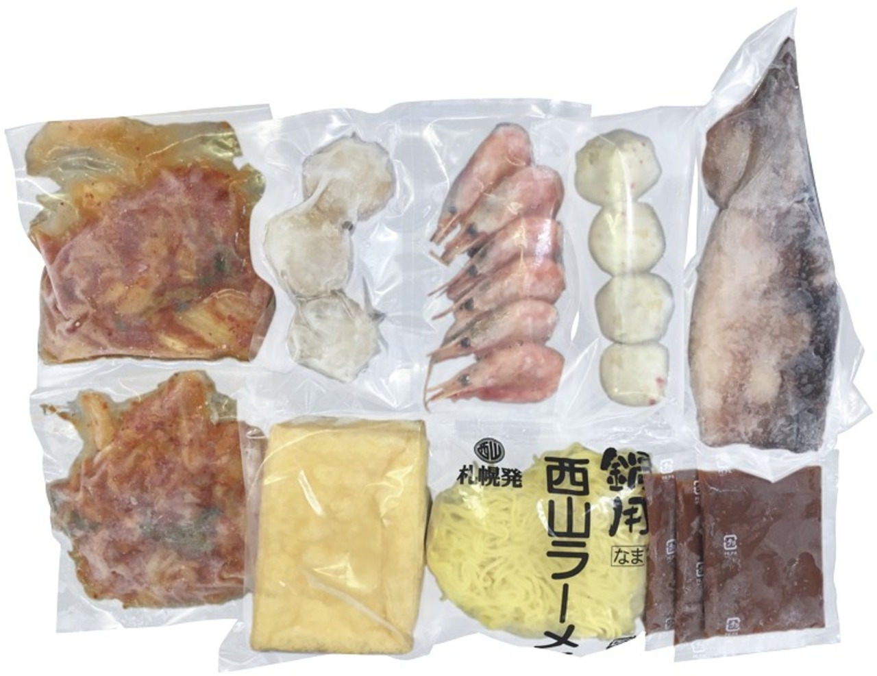 商品内容:白菜キムチ(約100g)・油揚げ(約10g)×各2、ボイル海老(約6g)×6、ボイル帆立(約20g)・たれ(濃縮:キムチ仕立て)(約30g)×各3、えび入つみれ(約20g)×4、ツボ抜きいか(約100g)・冷凍生ラーメン(約80g)×各1