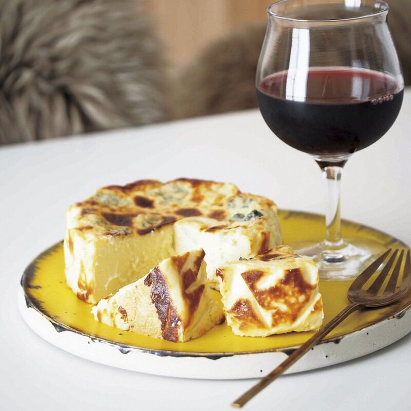 個性的な味わいがクセになるグルテンフリーのブルーチーズケーキ。奈良「植村牧場」の低温殺菌牛乳を使用し、高温殺菌では味わえない牛乳本来の味わいを残した濃いミルク感のバスクチーズケーキです。