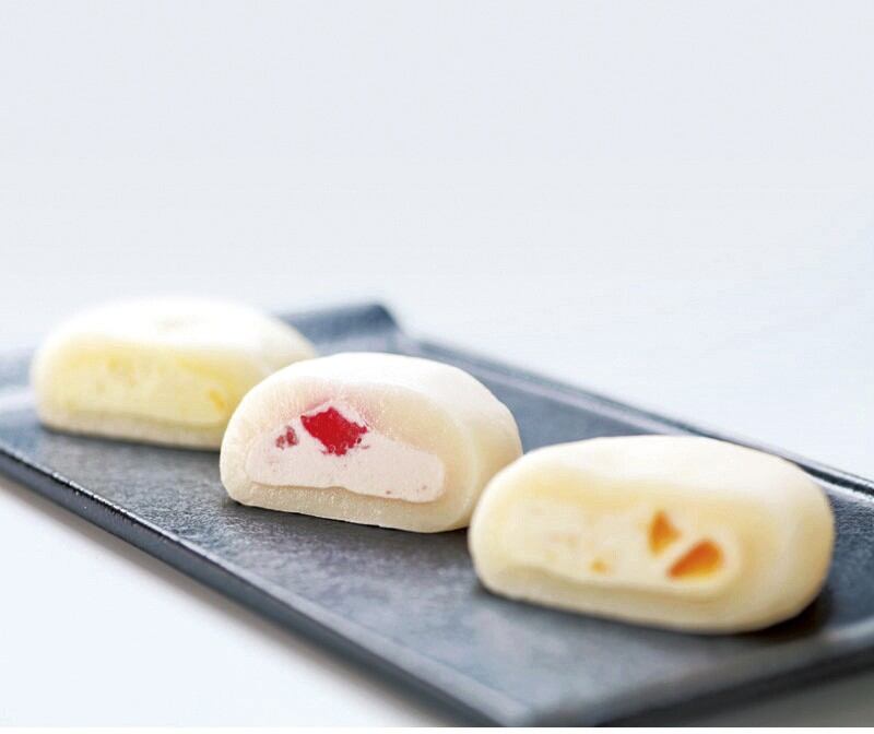 ふんわり食感にこだわって作った生クリーム大福。北海道生クリームに岡山県産清水白桃、瀬戸内産レモン、そしていちごのダイスカットを加え、マシュマロのように柔らかいお餅で包みこみました。