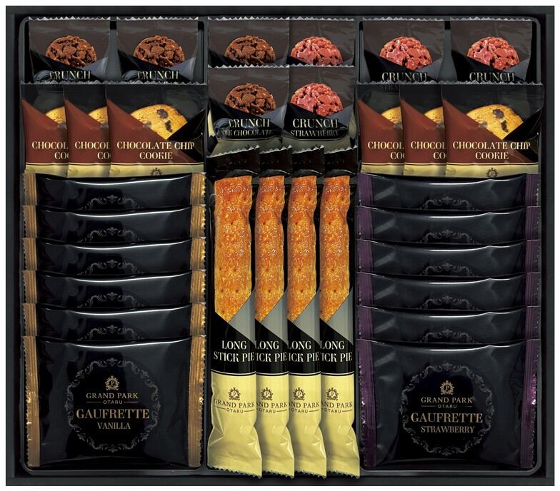商品内容:ゴーフレット(バニラ・ストロベリー)・チョコチップクッキー×各6、ロングスティックパイ・チョコクランチ(ミルク・ストロベリー)×各4