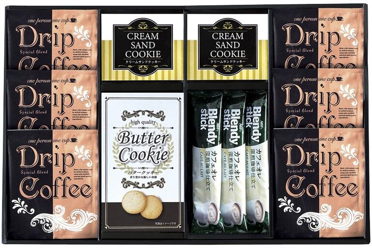 商品内容:ドリップコーヒー(約8g)×6、クリームサンドクッキー(2枚入)×2、バタークッキー(3枚入)×1、カフェオレ深煎珈琲(約14g)×3
