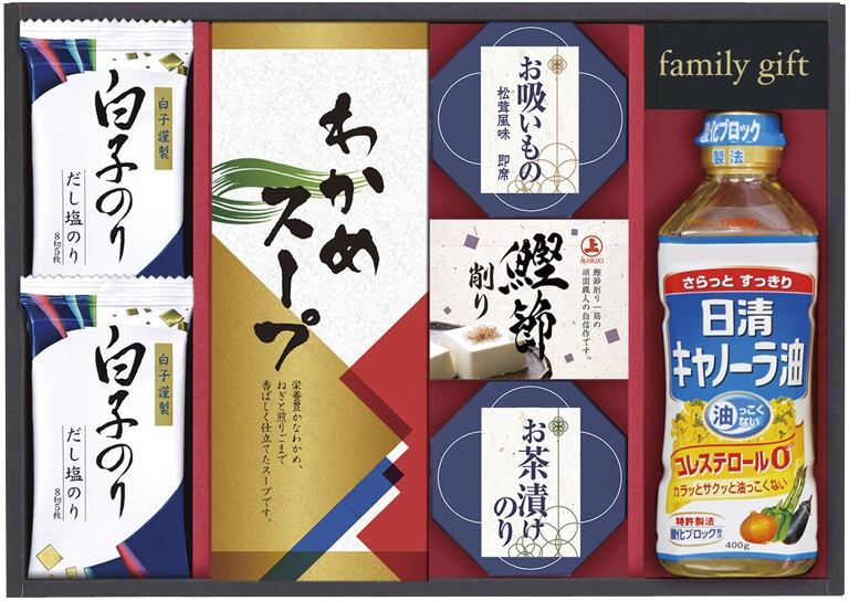 商品内容:白子だし塩のり(8切5枚)×2、わかめスープ(約5.3g×4袋)・永谷園お吸いもの松茸風味(約2.3g×2袋)・永谷園お茶漬けのり(約4.7g×2袋)・鰹節削り(約1.5g×2袋)・日清キャノーラ油(約400g)×各1