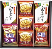 アマノフーズのだしの旨みと香りが引き立つ減塩おみそ汁と、国産たまねぎを使用したオニオンスープ、白子味のりを組み合わせたギフト商品です。