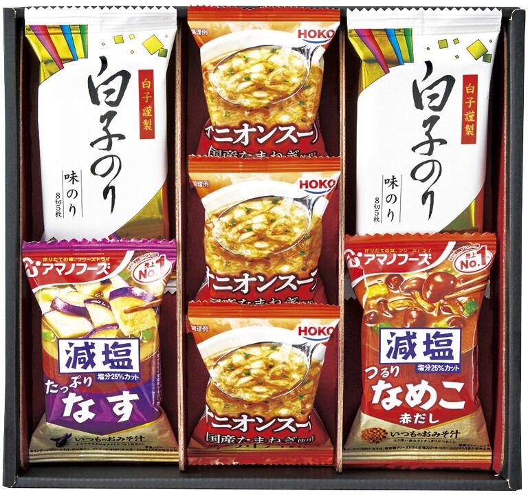 商品内容:アマノフーズ減塩いつものおみそ汁(なす・なめこ)×各1、宝幸 オニオンスープ×3、白子のり 味のり(8切5枚)×2
