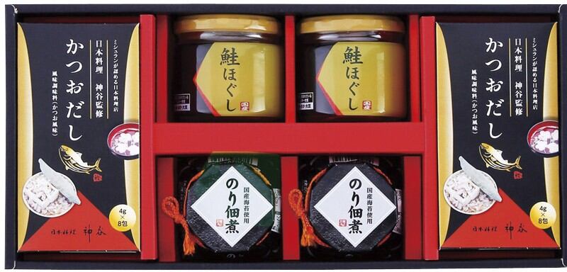 商品内容:鮭ほぐし(約50g)・のり佃煮(約80g)・かつおだし(約4g×8袋)×各2