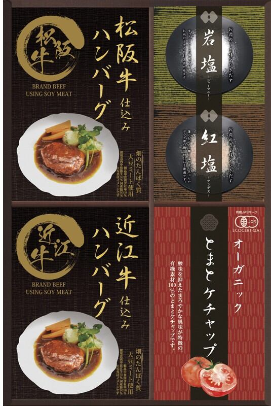 商品内容:松阪牛仕込みハンバーグ 大豆ミート入り(約130g)・近江牛仕込みハンバーグ 大豆ミート入り(約130g)・ジャーマニー岩塩(約30g)・アンデス紅塩(約30g)×各1、オーガニックトマトケチャップ(約10g)×8
