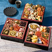 三段重、お重サイズ(外寸):縦175mm×横175mm×高さ175mm(内寸(1段):39mm) 、(43品目)、(約2〜3人前)【一の重】早煮昆布、煮あわび、梅麩、巻き湯葉、にしん甘露煮、にんじんうま煮、松前漬、紅ずわい蟹ほぐし身、帆立ひも佃煮、いくら醤油漬、サーモンとアスパラの和え物、帆立包み昆布、味付け数の子、さんま酢漬、北海しまえび 【二の重】たこ柔らか煮、紅白なます、北海道型昆布、黒豆煮、ローストビーフ、棒鱈煮、紅ずわい蟹爪、手まり餅、たらこと細切り昆布煮、さつまいものきんとん、さつまいものレモン煮、鱈の麹漬、鮭の麹漬 【三の重】よだれ鶏、チンゲン菜、ぶり照焼、姫竹うま煮、しいたけうま煮、鹿肉の佃煮、ローズサーモン、帆立うま煮、梅麩、鮭の西京漬焼、かきのオリーブオイル煮、伊達巻、クリームチーズとハスカップソース添え、アスパラの豚肉巻き、帆立のウニソース、茹でブロッコリー