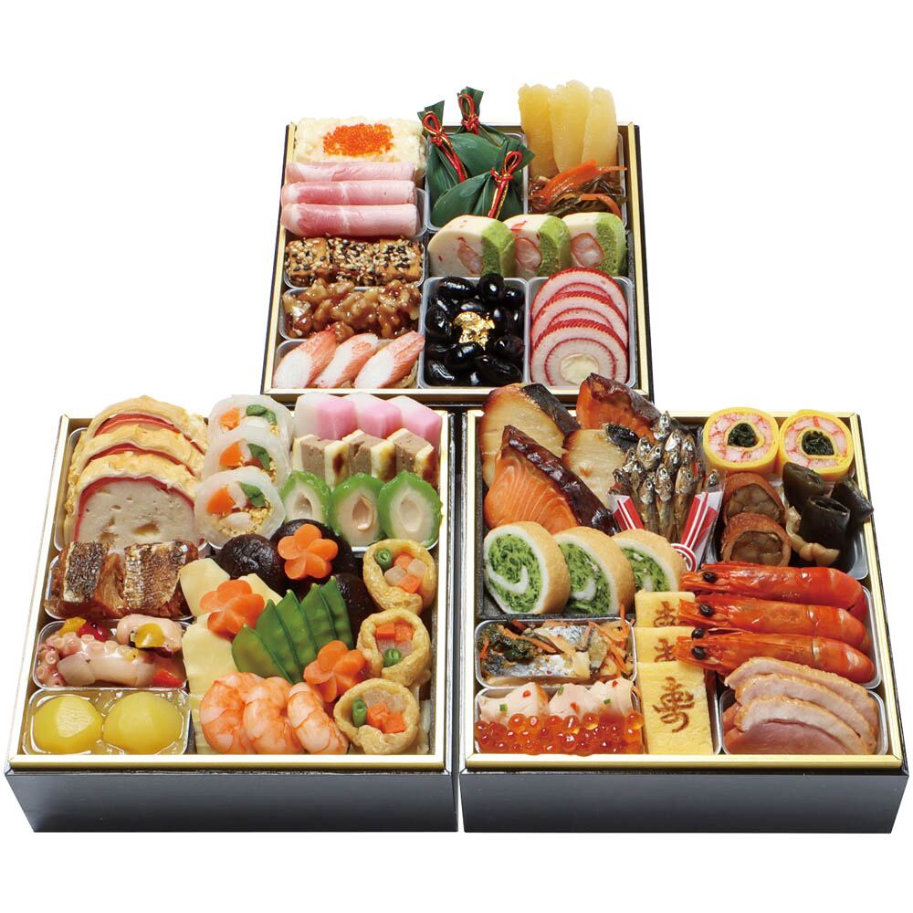 三段重、お重サイズ(外寸):縦165mm×横165mm×高さ175mm(内側の高さ(1段)35mm)、(42品目)、(約3人前)【一の重】鮭柚庵焼、鰆柚庵焼、田作り照煮、なごみ巻、花巻蒲鉾、穴子八幡巻、一口にしん昆布巻、にしん彩り親子和え、寿厚焼き玉子、海老艶煮、京なます、チキンマリネ、いくら、合鴨ロース 【二の重】りんごと豆腐のパイ包み、五色砧巻、切干し柚子、紅白蒲鉾、博多焼チーズ、若桃甘煮、棒鱈旨煮、椎茸旨煮、捻り梅人参、三色信田巻、穂付筍土佐煮、絹さや、海老沢煮、蛸バジルソース、栗きんとん 【三の重】北欧サラダ、とび子、ロースハム、笹よもぎ餅、祝い数の子、松前漬、胡麻ポテ、海老とアスパラのテリーヌ、胡桃甘露煮、福豆葡萄煮(金箔)、チーズオードブル、くらげ酢、香り蒲鉾