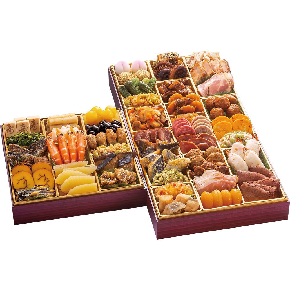 三段重、お重サイズ(外寸):縦248mm×横248mm×高さ160mm(内寸(1段)40mm)、(48品)、(約4〜5人前)【一の重】寿高野豆腐、菜の花のお浸し、いわし梅煮、カジキマグロ土佐煮、伊達巻、アーモンド田作り、たたき牛蒡、源平なます、祝い海老、味付け数の子、金団、栗甘露煮、黒豆蜜煮、鶏つくね照焼、ほたて真砂和え、ぶり照焼、胡麻胡桃【二の重】牛タンパストラミ、ブリのエスカベッシュ、さわらの香味焼、蒸し鶏バジル、玉ねぎとピーマンのマリネ、サーモンの酢漬、ボロニアソーセージ、ボロニアソーセージハーブ、タンスモーク塩レモン、ミニハンバーグ、豚ハラミ黒胡椒、炙り生ハム炭火仕立て、ラム風味あんず、オマール海老のビスク風、海鮮チーズサラダ、爪付カニしんじょう、ローストビーフ【三の重】花餅桃、胡麻団子、若つみ小胡瓜、中華帆立、酢どり、胡麻ポテ紅はるか、中華風たこ旨煮、中華風角煮、九州産芝海老チリソース、中華くらげ、蒸し鶏バンバンジー、鶏テリーヌ、黒糖ローストポーク、餡かけ肉団子
