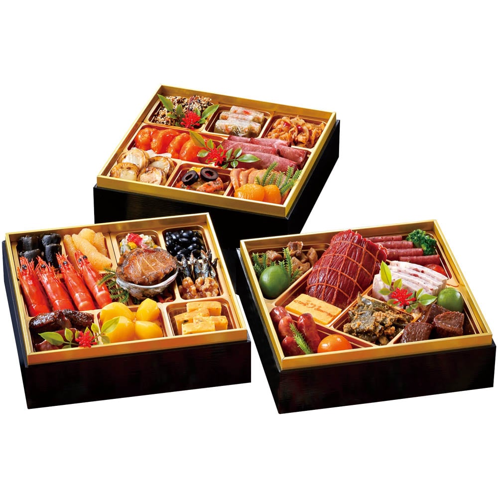 三段重、お重サイズ(外寸):縦195mm×横195mm×高さ186mm(内寸(1段):40mm)、(37品目+牛たん)、(約3〜4人前)【一の重】牛たん佃煮、若桃甘露煮、おつまみ牛たん、ブロッコリーコンソメ風味、ドライトマトワイン煮、牛たんスモーク、牛たん入玉子焼、牛たんテリーヌ、南蛮味噌、牛たんちびたん燻、金柑蜜煮、牛たん角煮 【二の重】昆布巻、味付数の子、にしんレモンマリネ、黒豆煮、海老の旨煮、鮑煮、松前煮、田作り煮、くるみ甘露煮、ぶり照焼、きんとん、栗甘露煮、チーズふくさ焼 【三の重】ごまぽて、糸昆布柚子煮、かに煮こごり、帆立ひもの中華風、海老チリ、ローストビーフ、オニオンマリネ、帆立香草焼、サーモンバジル、オリーブ、合鴨スモーク、杏子煮【別添】牛たん真空パック(塩味)100g
