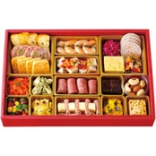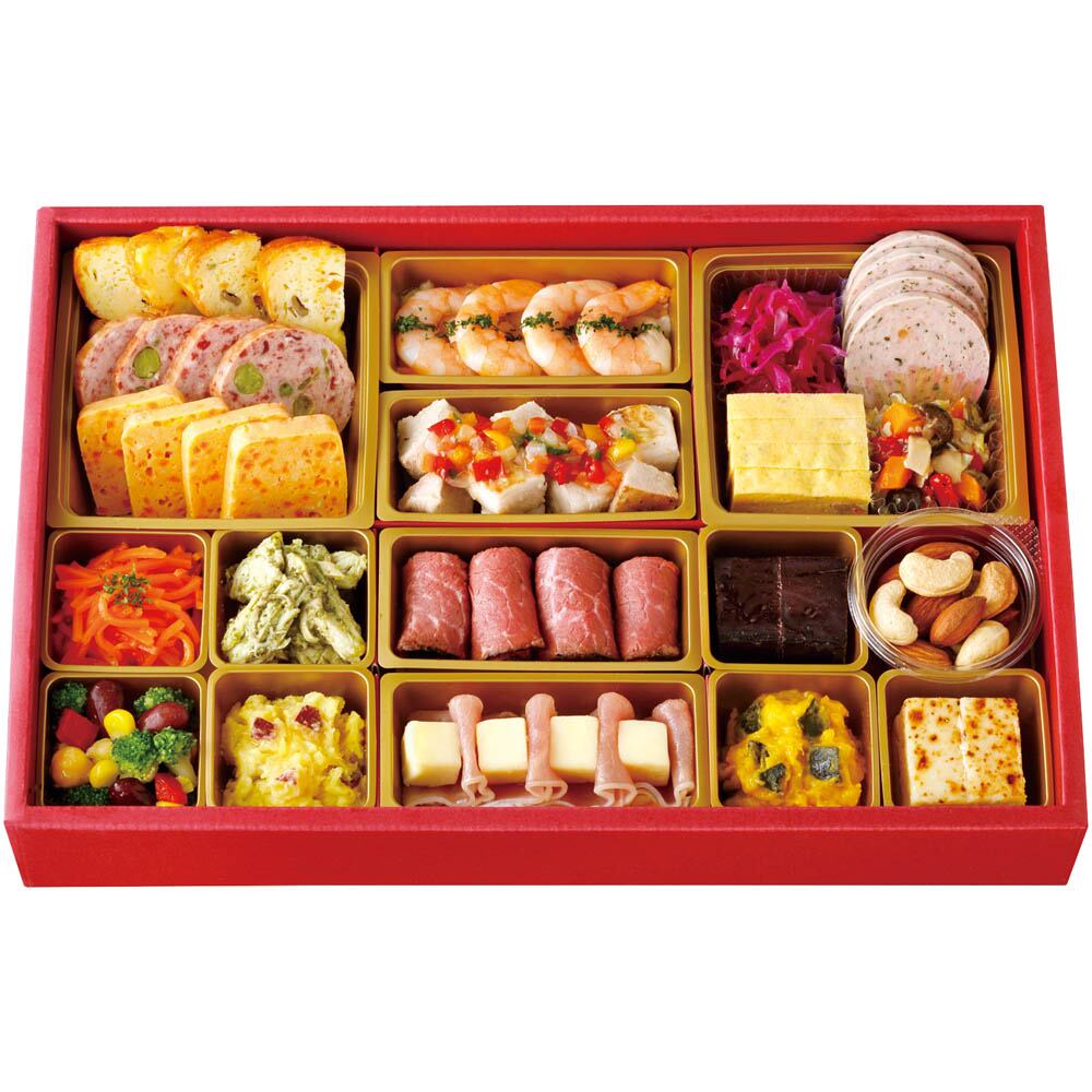 一段重、お重サイズ(外寸):縦214mm×横316mm×高さ48mm(内寸(1段)高さ:47mm)、(23品目)、(約4人前)【一の重】野菜とベーコンのケークサレ、モルタデラソーセージ、鶏肉と人参のテリーヌ、ポテトサラダ、カクテルシュリンプ、紫キャベツのラペ、ヴァイスブルスト、スペイン風オムレツ、きのこと野菜のマリネ、ローストポーク(カラフルマリネ添え)、キャロットラペ、蒸し鶏のバジル和え、ローストビーフ、ローストビーフソース、ショコラテリーヌ、ローストアーモンド、ローストカシューナッツ、ブロッコリーの彩りレモンサラダ、さつまいものサラダ、コールスローサラダ(キャベツ&コーン)、生ハム(ロース)、キューブチーズ、かぼちゃのサラダ、チーズケーキブリュレ