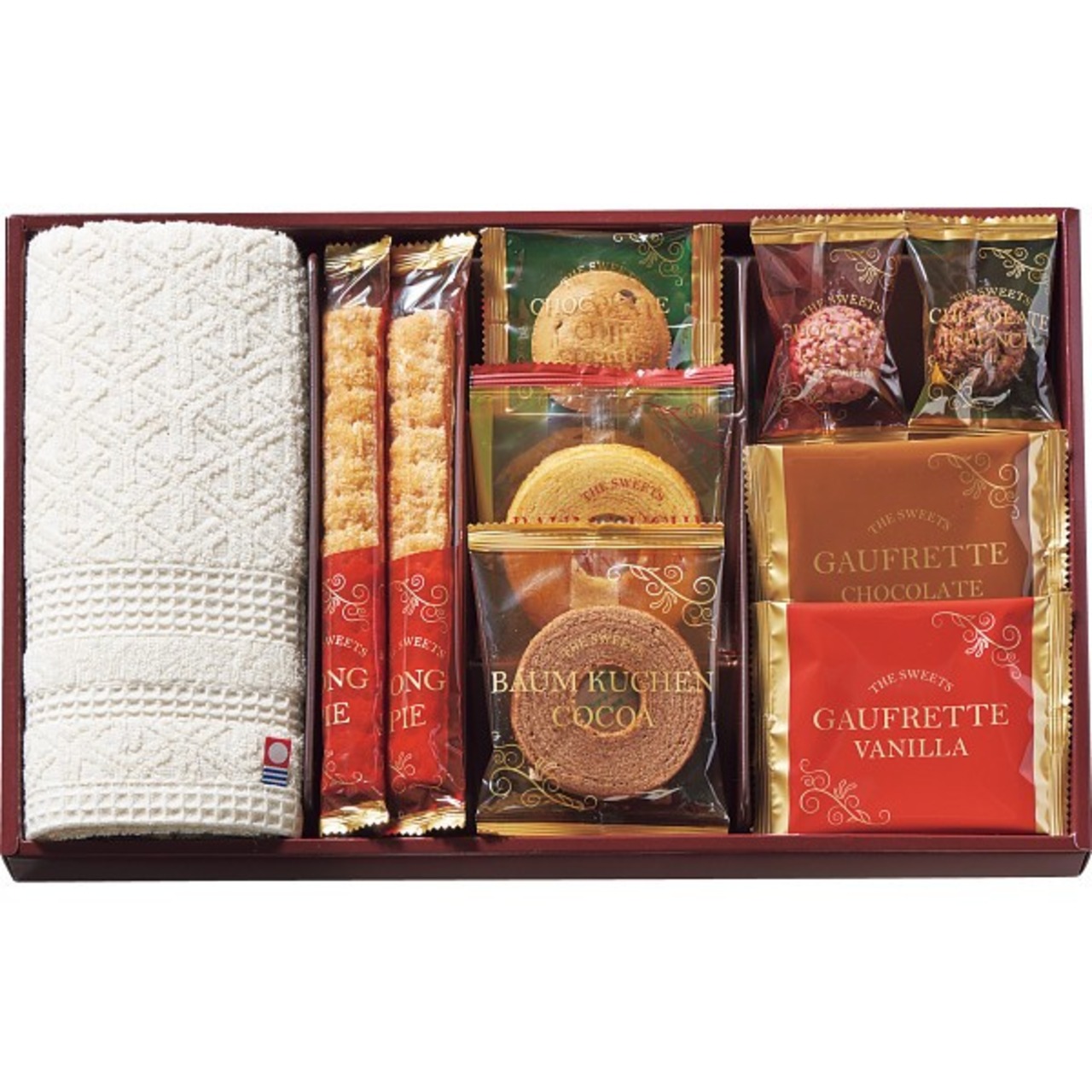 商品内容:●チョコチップクッキー×1・ロングスティックパイ×2・バウムクーヘン(ココア)×1・バウムクーヘン(バニラ)×1・ゴーフレット(チョコ)×1・ゴーフレット(バニラ)×1・チョコレートクランチ(ミルク)×1・チョコレートクランチ(ストロベリー)×1・ウォッシュタオル(約34×35cm・綿100%・日本製)×1