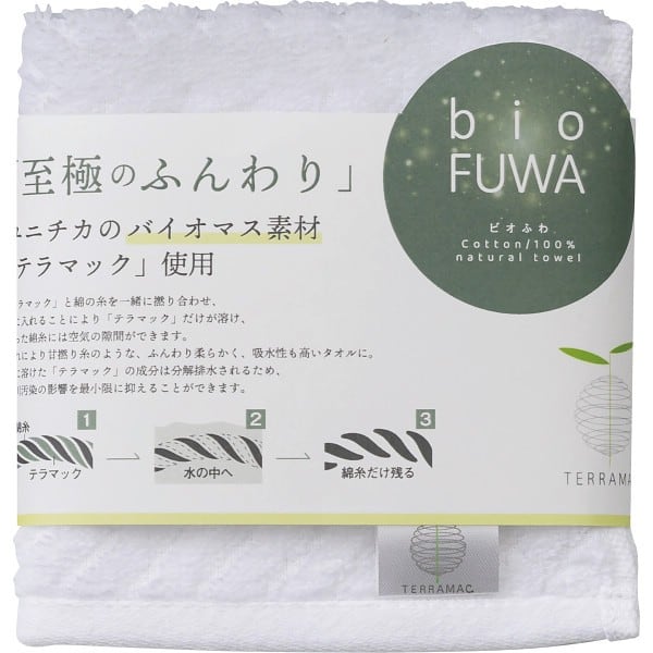 ユニチカのバイオマス素材『テラマック』を使用した、環境に配慮したタオルハンカチ。軽くて、ボリュームがあり、吸水性も抜群です。
