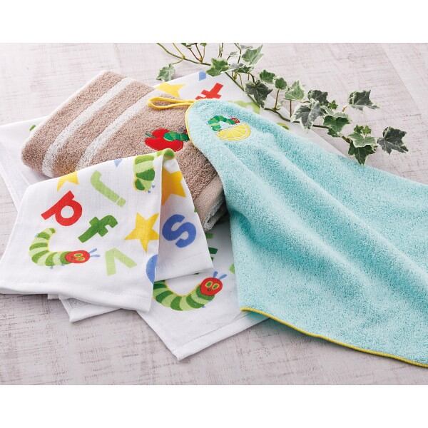 大胆な色使いで大人から子供まで幅広く愛されている絵本「はらぺこあおむし」の、鮮やかな色使いのタオルセットです。