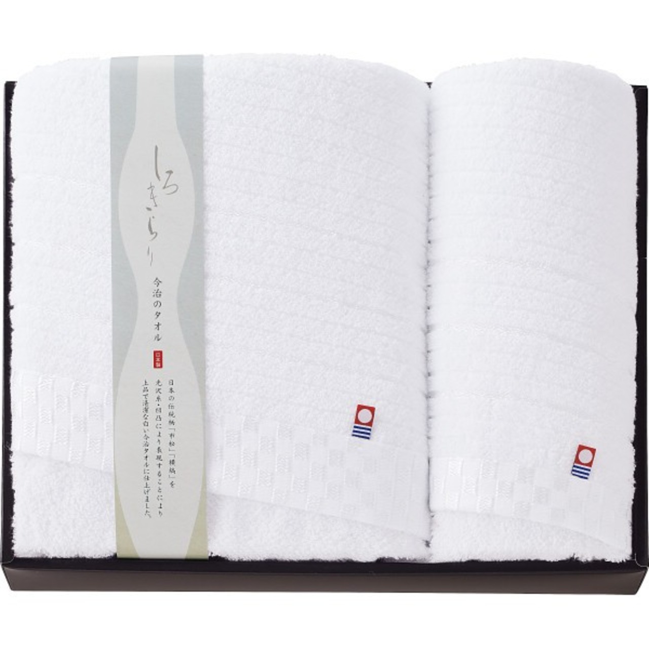 日本の伝統柄『市松』と『横縞』を、光沢糸とジャカード織りの凹凸により美しく表現しました。上品で清潔感あふれるまっ白な今治タオルに仕上げています。