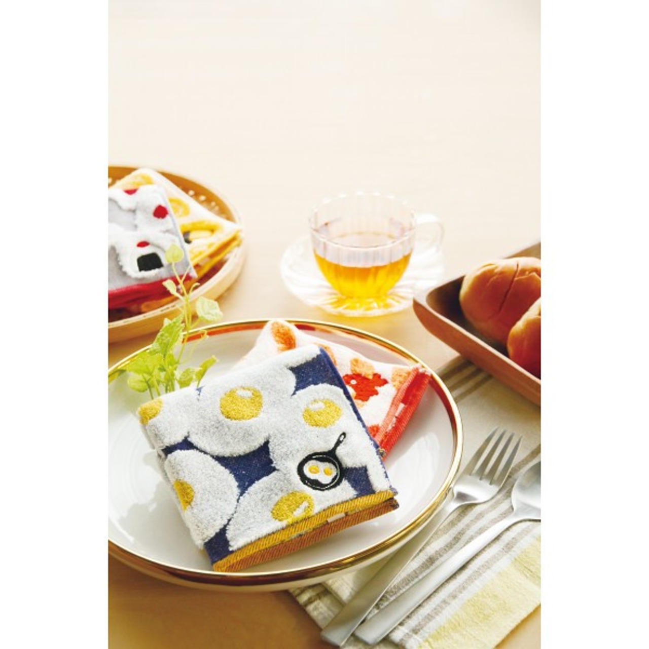 食べること、料理が大好きな人へ どんな嫌なことがあっても、食べ物は心を温かく、幸せにしてくれる。そんな食べ物の不思議な魅力をハンカチに込めました。普通糸と無撚糸を組み合わせることでふんわりと優しい触り心地。