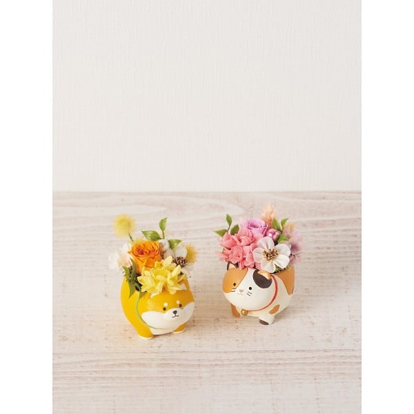華やかなプリザーブドフラワーを手のひらサイズの可愛らしいアニマルポットに合わせました。アニマルの表情にほっこりします。