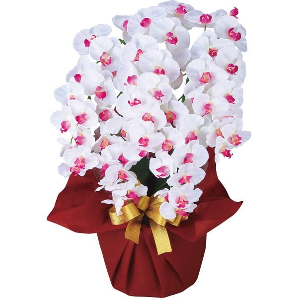 3本立よりも豪華な見栄え!華やかな大輪5本立ち胡蝶蘭。エアコンの風量や窓からの光量なども気遣う必要がなく、水やりなど生花のようなお世話は不要。軽いので女性でも簡単に持ち運びが可能で、誰でも気軽に胡蝶蘭の美しさをお楽しみいただけます。ST/CT触媒加工されていますので、お部屋の空気もキレイにしてくれます。
