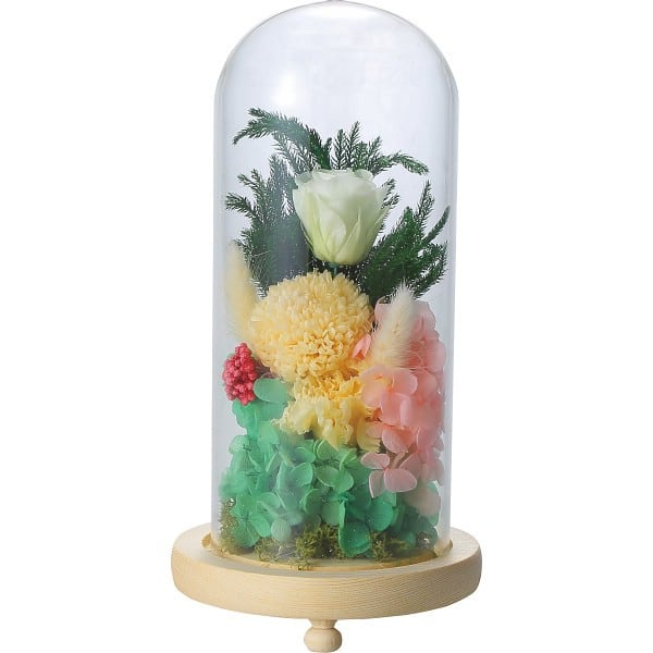 商品材料:●プリザーブドフラワー・ドライフラワー(自然素材)・ワイヤー(紙・鉄)・スポンジ・ドーム(ガラス)・台座(木)