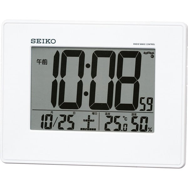 大型液晶で見やすい時計です。お手軽な価格の掛置兼用の電波目ざまし時計です。