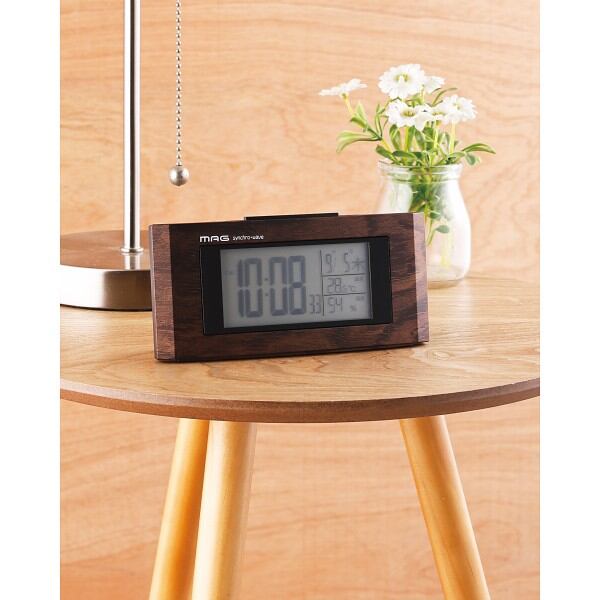 木目調の高級感のある温度湿度表示付きのデジタル電波時計です。