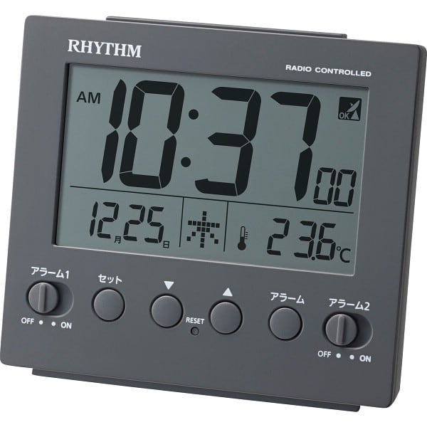 癖のないシックなグレイッシュカラーが特徴、Wアラームつきの電波デジタルめざまし時計です。