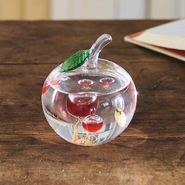有名なニュートンのりんごを連想させつつ、どこかメルヘンなムードも持ち合わせたインテリア性の高いガラスフロート温度計。通称“ガリレオ温度計”の名前でも知られ、気温によって液体の比重が変化することから、ガラス球体の浮き沈みにより、りんごの色づきがその時々で変化するのを楽しめます。