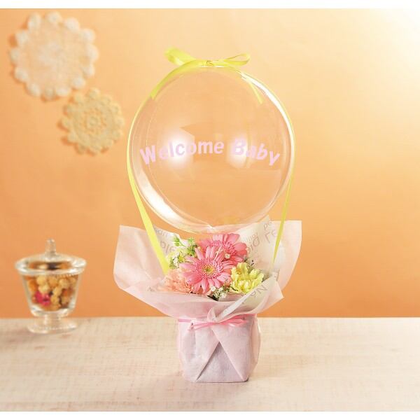 気持ちを届けるメッセージ入りのバルーンとお花がコラボレーションしたバルーンアレンジ。そのまま飾ることができ手間がかからないため、出産祝いにぴったりです。