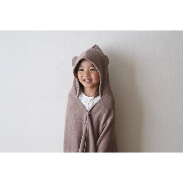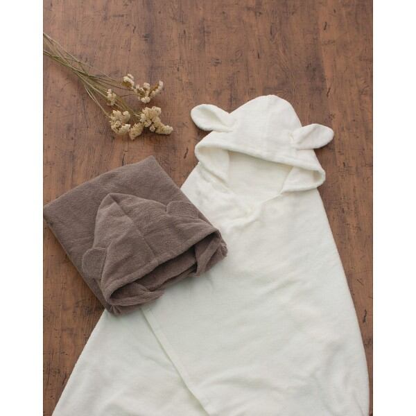 オーガニックコットン100%のやさしい心地のキュートな耳付きバスポンチョ。お風呂上りやおくるみなどにお使いいただけます。