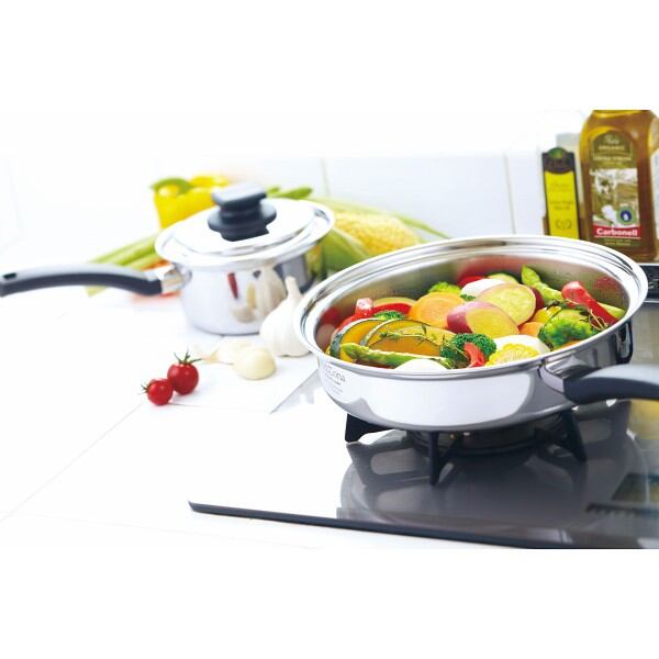 ステンレスとアルミニウムの全面5層構造で「熱しやすく、冷めにくい」理想的な熱効率を実現。小さな火力でも均一に熱を伝えることができ、短時間調理や余熱調理ができるので、省エネにも。素材の水分や少量の水で調理する無水調理で、野菜の栄養を逃さず、色鮮やかに仕上がり、素材の味を楽しめます。素材の脂分で調理する無油調理、炊飯、オーブン調理などマルチに活躍します。