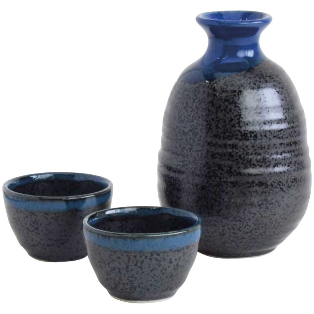 天目の黒に鮮やかな青釉が映える味わい深い酒器揃