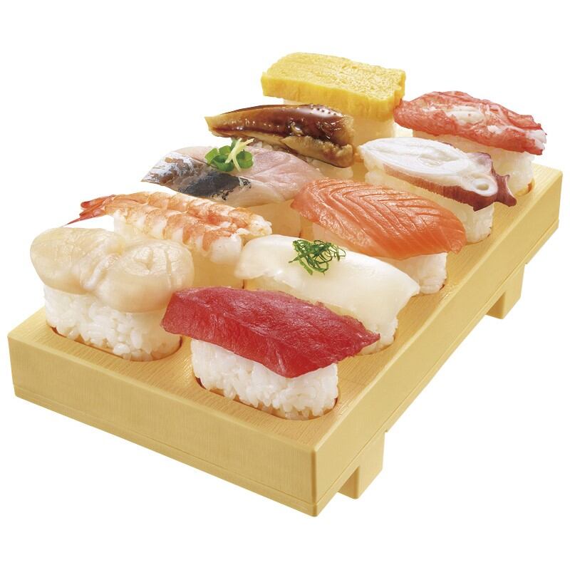 にぎり寿司が一度に10貫作れるすし下駄型のすし器です。枠にごはんを詰めて押し型の上に置くだけでお寿司が登場。