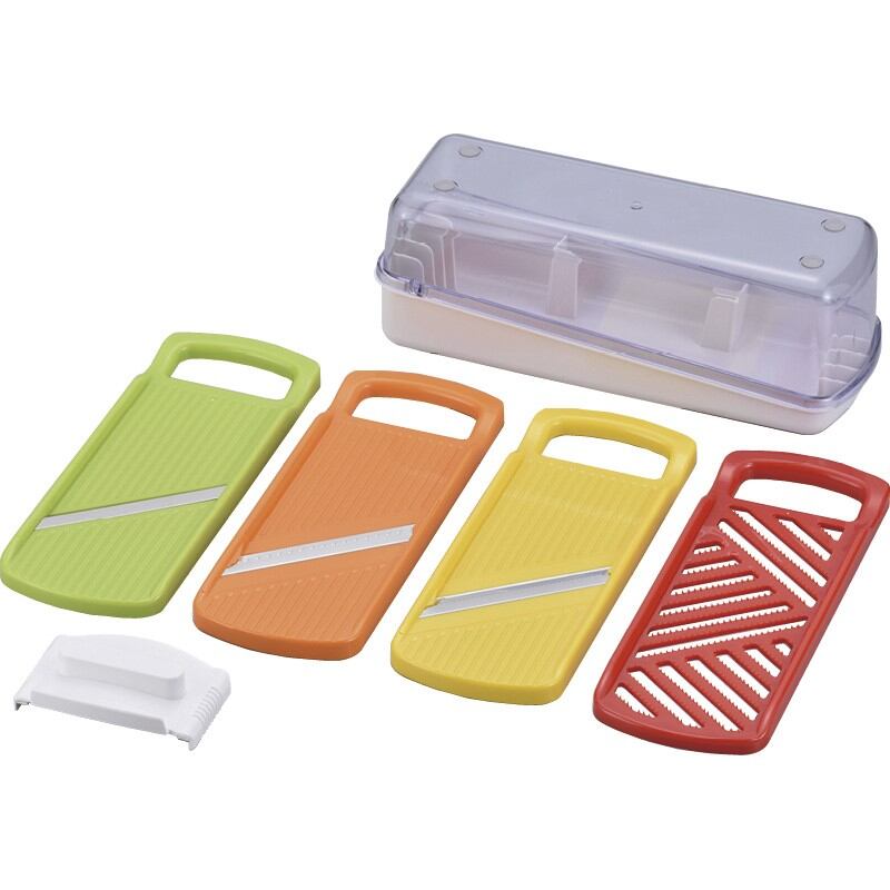 商品内容:スライサー・千切り・つま切り・おろし・安全ホルダー・収納ケース(23.5×8.5×8.8cm)・容器×各1