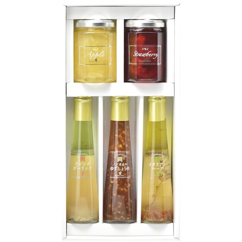 商品内容:ジャム(りんご・いちご)(各145g)・ドレッシング(フレンチガーリック・ノンオイルゆずしょうゆ・イタリアンハーブ)(各122ml)×各1