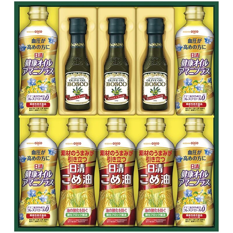 ボスコエキストラバージンオリーブオイルに日清健康オイルアマニプラス、日清こめ油を詰め合わせたギフト。