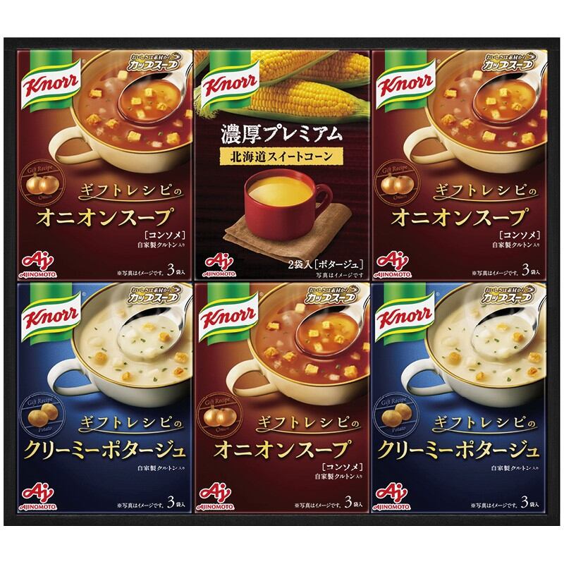 商品内容:カップスープギフトレシピのオニオンスープ(3袋入)×3、カップスープギフトレシピのクリーミーポタージュ(3袋入)×2、贅沢野菜北海道スイートコーン(2袋入)×1